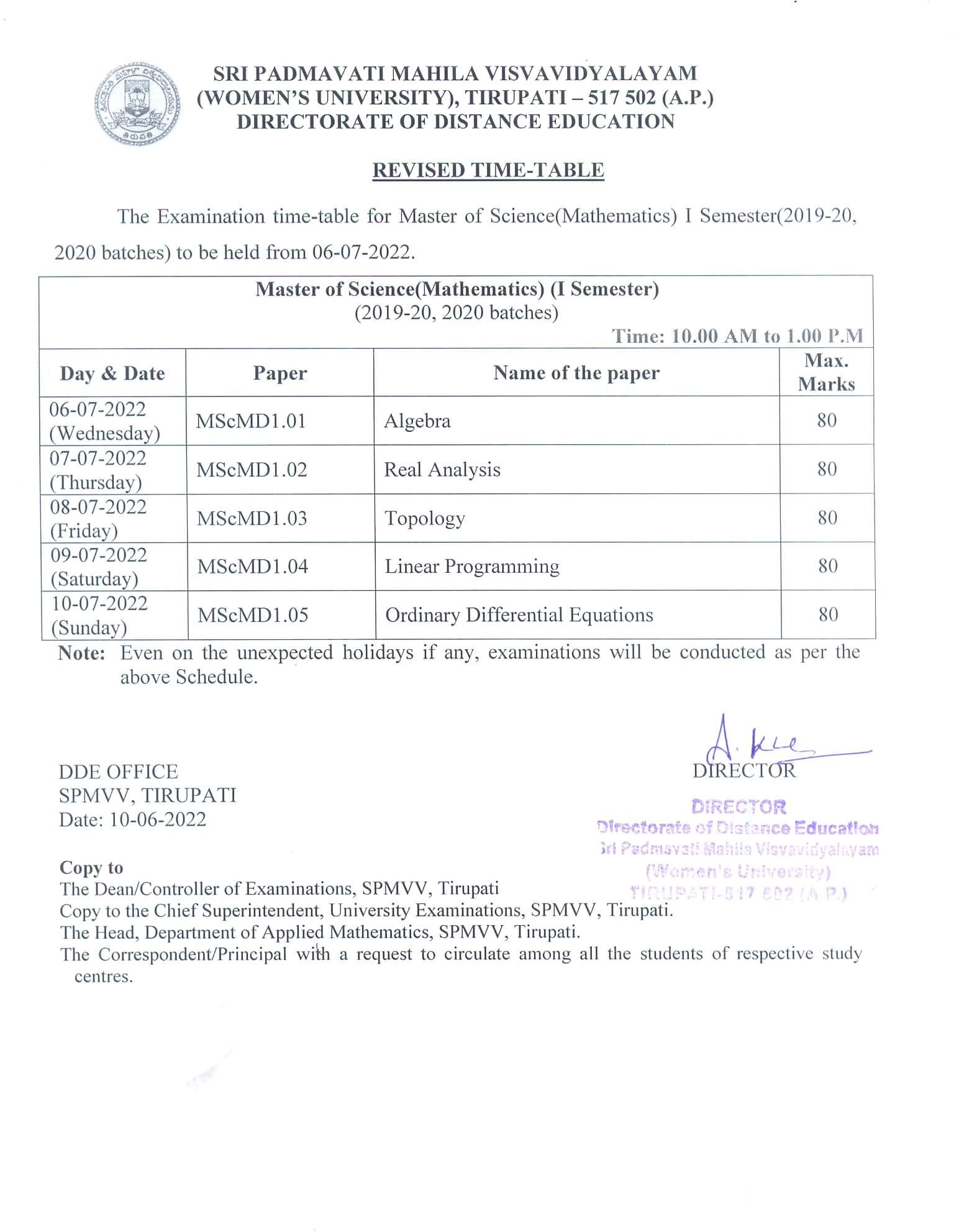 - Master of Science (Mathematics) 1st Semester Exam Timetable